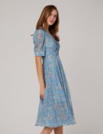 MARYLING Blue floral pattern V neck ruffle pleated puff sleeves dress