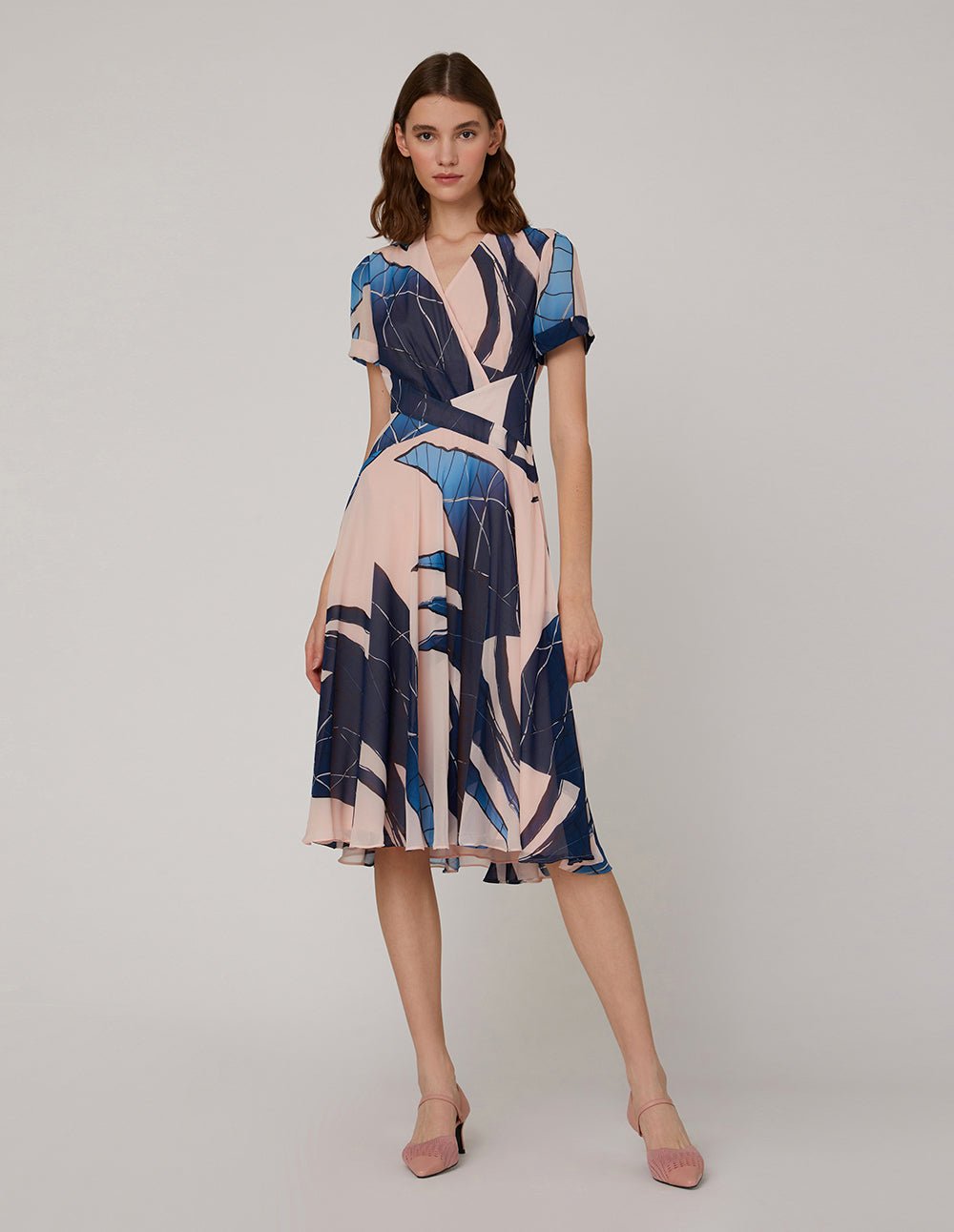 This dress brings dynamic variation with a cross-split design at the waist. A delicate V-shaped neckline and delicate pleated decoration add a touch of elegance and femininity. The large wavy skirt adds a smart and light atmosphere. Irregular art prints make people feel atmospheric and intellectual.