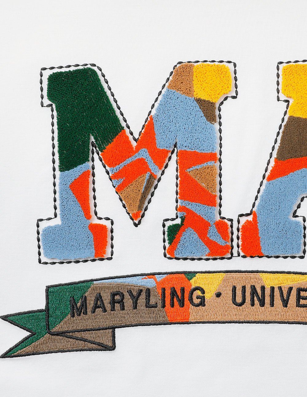MARYLING is inspired by printing patterns. It uses the thick and lively century school book font as the decorative pattern and uses three-dimensional toothbrush embroidery technology to interpret it. The short T-shirt version. three-dimensional embroidery. and toothbrush embroidery show exquisite embroidery craftsmanship. and the college style is more youthful and energetic.